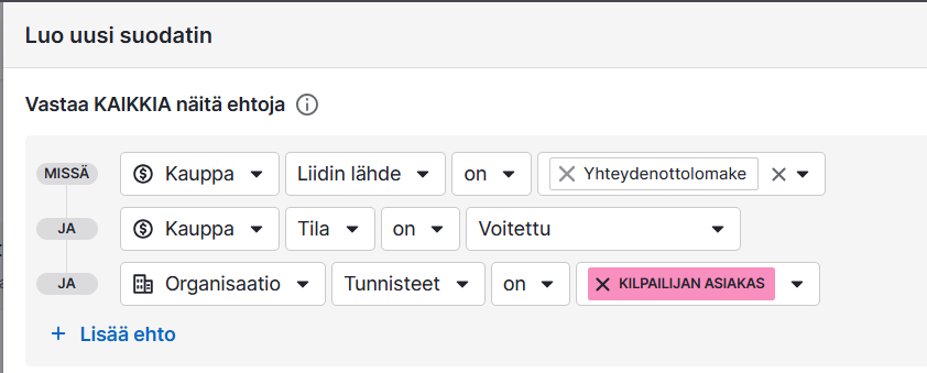 Aika ajoin on hyvä tarkastella hävittyjä kauppoja, sillä asiakkaan tilanne on saattanut muuttua edelliskerrasta tai teillä on uusia tuotteita tarjottavaksi. Suodattimen ehtoina voi käyttää esimerkiksi: