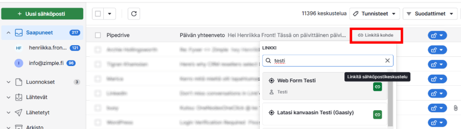 Sähköpostien synkronointi Pipedriveen on yksi parhaista tavoista jakaa asiakastietoa ja varmistaa saumaton tiedonkulku ja asiakaspalvelun laatu tiimin kesken. Sähköpostit eivät kuitenkaan aina osaa linkittyä juuri oikeisiin kauppoihin tai liideihin, joten Pipedrive onkin nyt helpottanut linkityksen tekemistä käsin: Jatkossa linkittämisen voi tehdä joko Inbox-näkymässä sähköpostien listauksessa suoraan tai esim. organisaation näkymässä itse sähköpostin kohdalta.