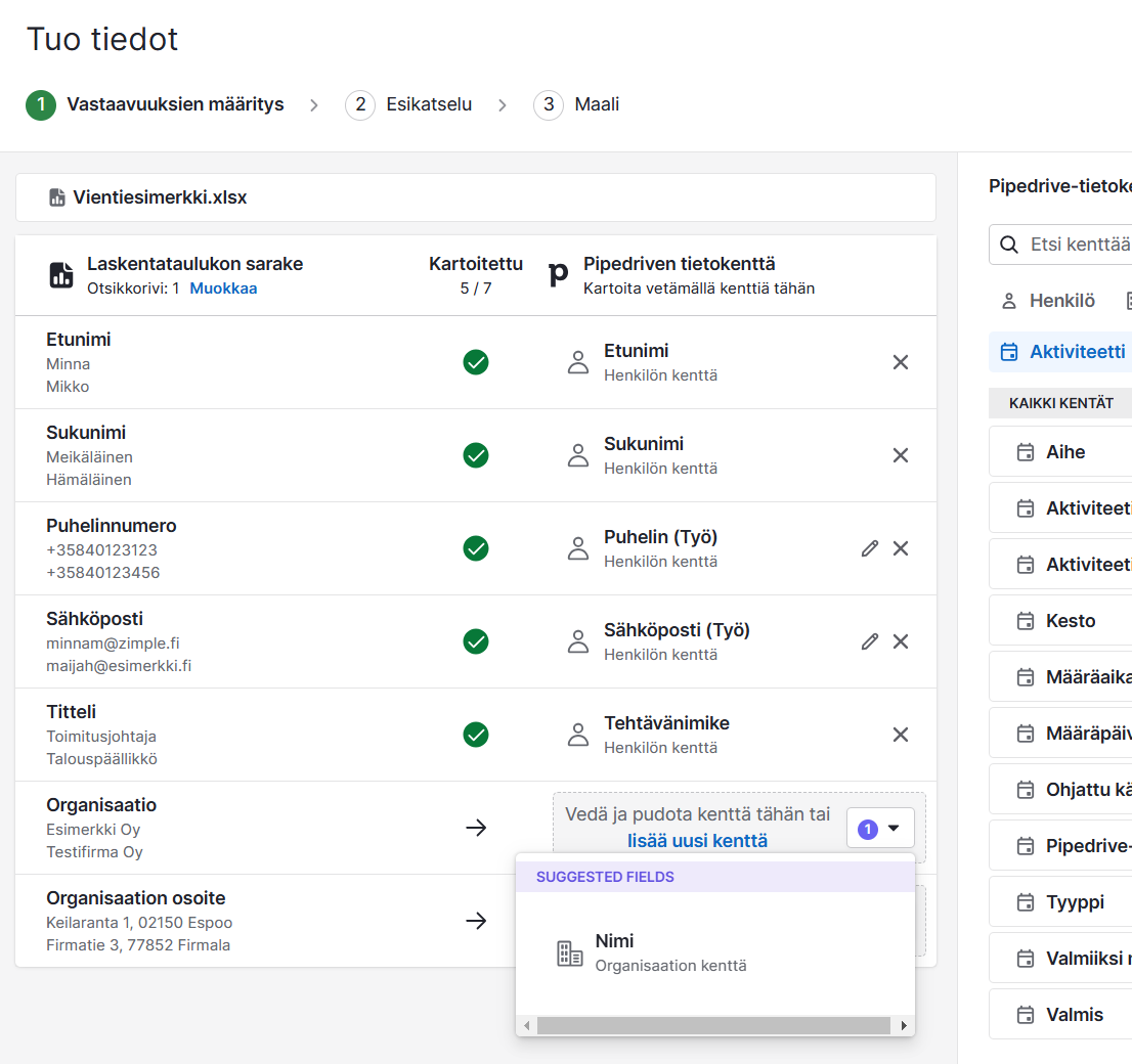 Parannettu tietojen tuonti Excelistä: Vaikka taulukoista tiedon tuominen on aina ollut suhteellisen simppeliä Pipedrivessa, nyt sitäkin on parannettu entisestään. Järjestelmä ohjaa paremmin mätsäämään Excelissä olevan tiedon Pipedriven tietokenttiin, jotta virheiltä vältyttäisiin tässä kohtaa erityisesti, kun tuodaan monipuolista tietoa (ihmisiä, organisaatioita, kauppoja ja aktiviteetteja).