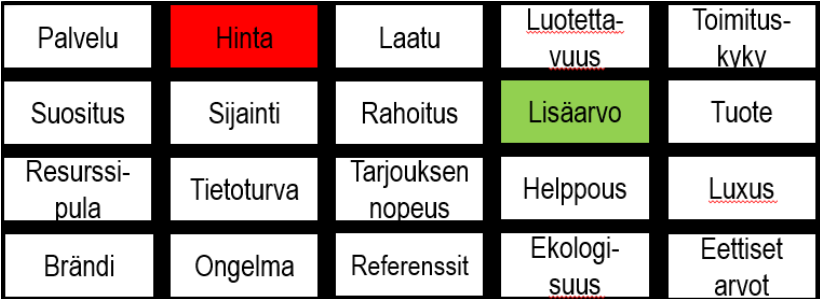 Ostokriteerejä puolestaan on B2B-liiketoiminnassa 20 (kuva alla). Näistä hinta ja lisäarvo ovat toistensa vastakohtia, eli mitä enemmän tuote/palvelu tuottaa taloudellista lisäarvoa (eli nopea takaisinmaksuaika tai korkea ROI), sitä pienempi merkitys hinnalla on.