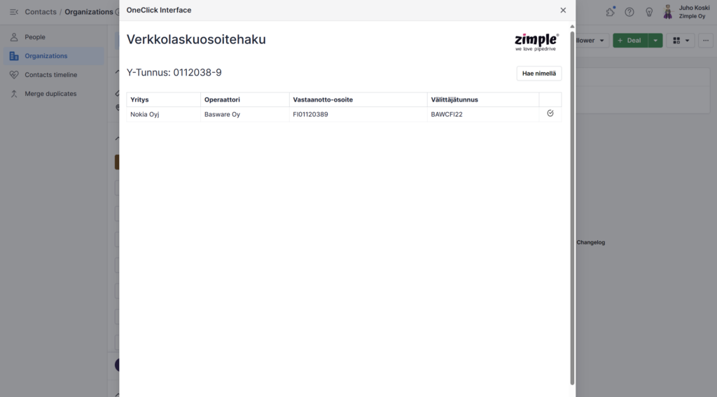 Olemme rakentaneet OneClick-alustaa hyödyntäen lisäosan, jossa voit nappia painamalla hakea TIEKE:n palvelusta hakemasi yrityksen verkkolaskuosoitetiedot. Voit näistä sitten valita oikean ja toisella napin painalluksella lisätä tiedot organisaatiolle oikeaan paikkaan.