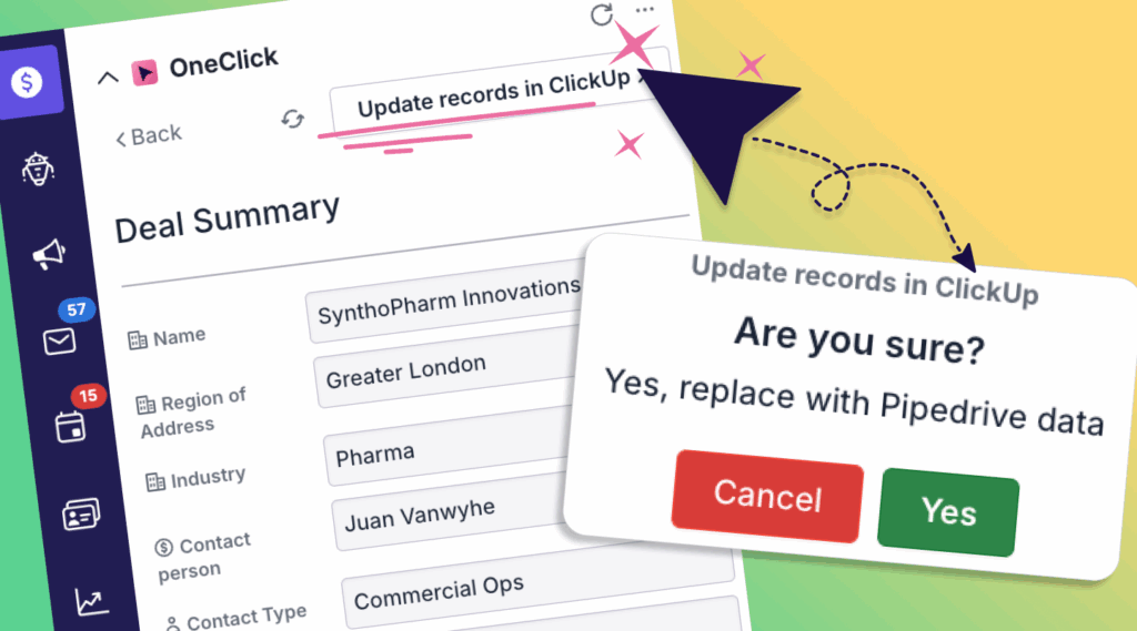 The user sees what will happen, when, and with whom. Want to sync details? Push data? Access a Link? Trigger a workflow? OneClick asks for confirmation and gets it done.